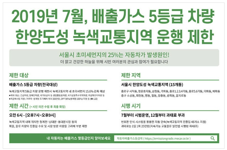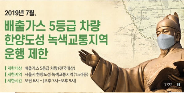미세먼지 문제가 심각한 환경문제로 부각되면서 서울시는 7월 1일부터 서울 사대문 안 녹색교통진흥지역(한양도성 내 16.7㎢)에서 배출가스 5등급 차량의 통행을 제한한다고 합니다.