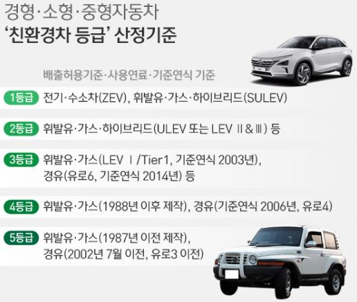 5등급 차량은 대부분 2002년 7월 이전 제작된 경유차가 해당된다고 볼 수 있습니다. 유럽의 자동차 배출가스 허용기준 유로3 이전 기준을 적용받는 차량인데요. 휘발유와 가스는 1987년 이전 제작된 차량이 해당됩니다.