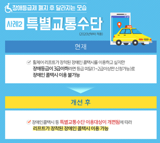 2020년 부터는 1,2급 장애인만 이용할 수 있었던 휠체어가 장착된 장애인 콜택시도 중증의 보행 장애가 있으면 누구나 이용할 수 있게 되며, 택시 차량 수도 200명당 1대 수준에서 150명당 1대로 늘어날 예정입니다.