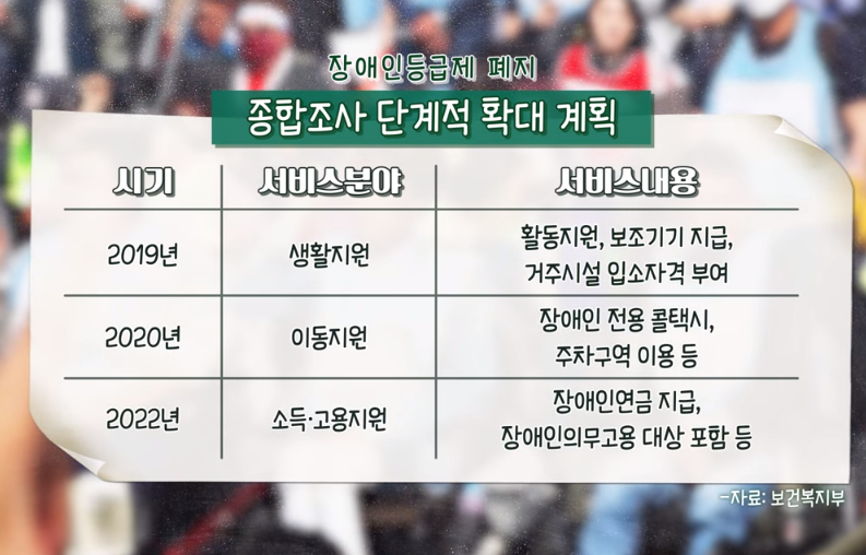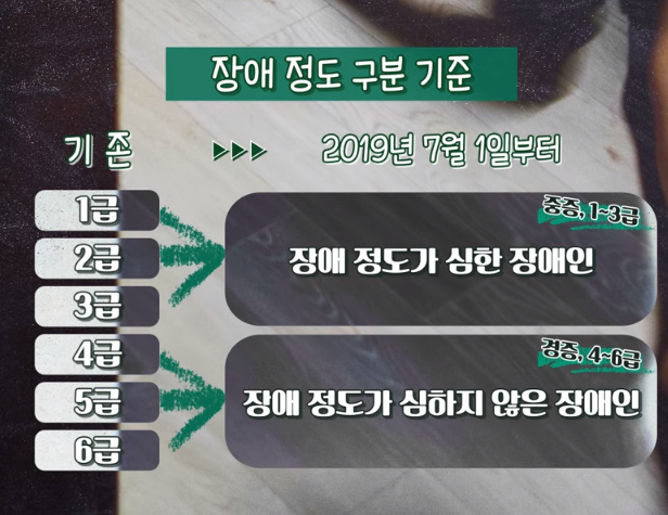 그래서 장애인의 구분을 중증과 경증으로 간소화하고, 장애인이 받을 수 있는 서비스를 좀 더 확대해서 많은 분들이 혜택을 받을 수 있도록 하는데요.