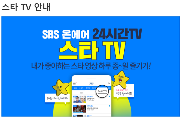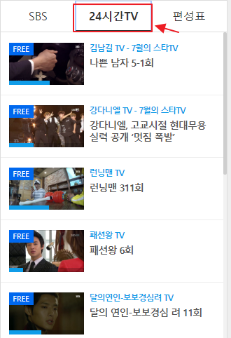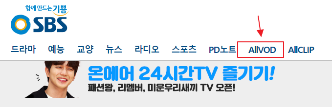 그리고 24시간 스타TV 뿐 아니라 ALL VOD 메뉴를 클릭하시면 SBS에서 방영중이거나 방영했던 영상을 무료로 시청이 가능합니다.
