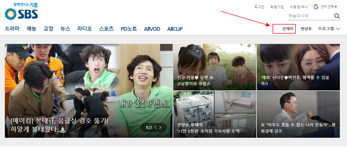 sbs 홈페이지에서 오른쪽 상단에 보시면 온에어 메뉴가 보입니다. 클릭해 주세요.