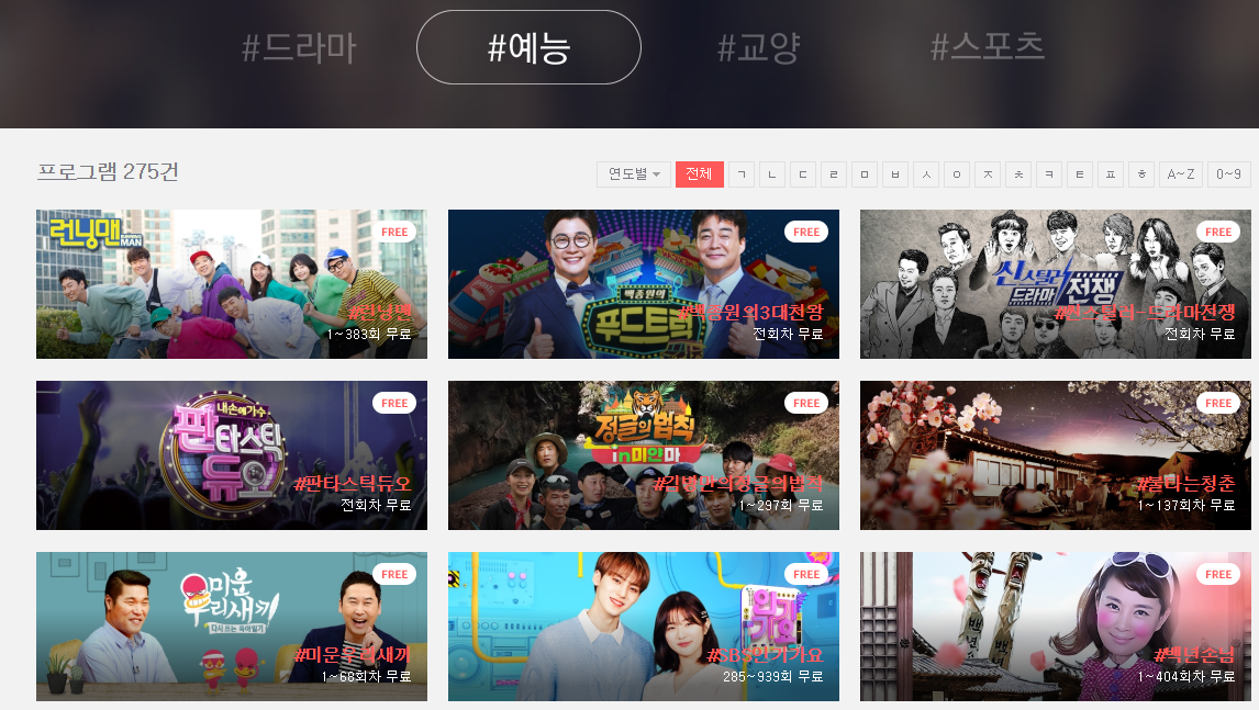 여기서 드라마, 예능, 교양, 스포츠 카테고리가 있고 해당되는 카테고리에서 원하는 프로그램을 무료로 시청하실 수 있습니다.
