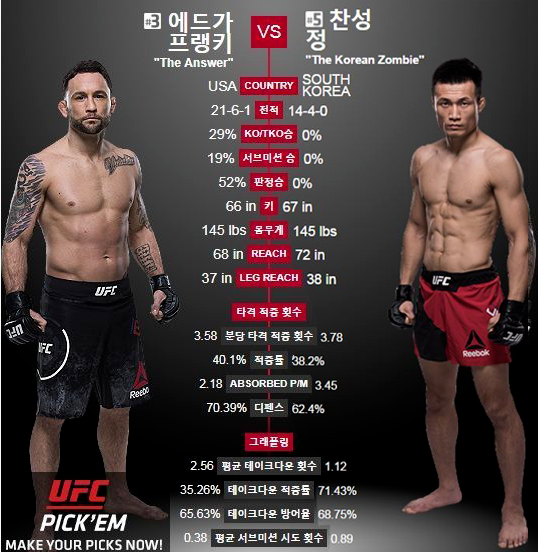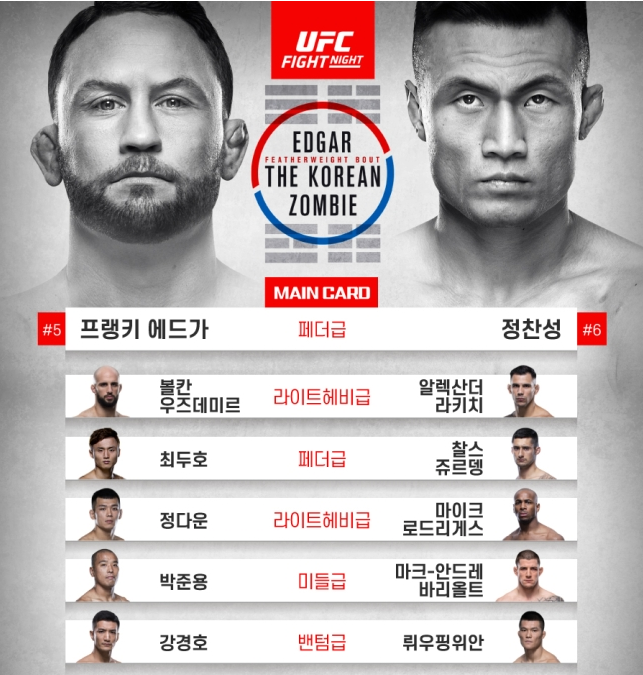 세계 랭킹 7위 정찬성과 랭킹 5위 에드가가 맞붙는 빅 경기가 진행될 예정입니다. 한국에서는 정찬성 외에 2년여 만에 경기에 나서는 최두호와 3연승에 도전하는 강경호, 마동현, 정다운, 최승우 등 UFC에서 활약하는 국내 파이터 대부분이 출전합니다.