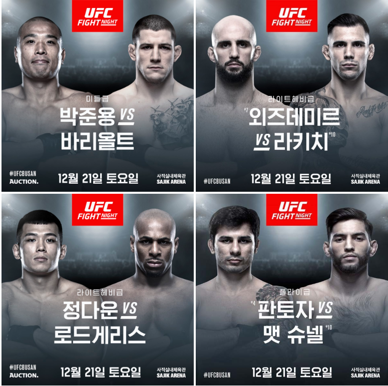 라이트 헤비급 랭킹 8위 볼칸 외즈데미리와 10위 알렉산서 라키치가 출전을 확정했고, 플라이급 랭킹 4윌 알렉산드레 판토자와 9위 맷 슈넬 또한 부산에서 맞붙습니다.