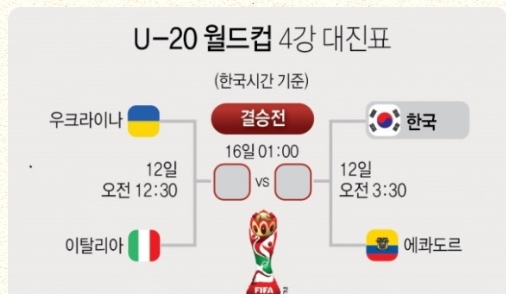 이제 4강입니다. 대한민국과 에콰도르가 4강에서 만나고, 이탈리아와 우크라이나와 만납니다. 결승 진출을 앞두고 4강 맞대결에서 어떤 승부를 할지 기대가 되는데요. 우리나라보다 3시간 먼저 열리는 이탈리아와 우크라이나의 대결에도 관심이 가는데요. 우리나라가 결승에 진출한다면 이탈리아와 우크라이나 승자와 우승컵을 다투기 때문입니다.