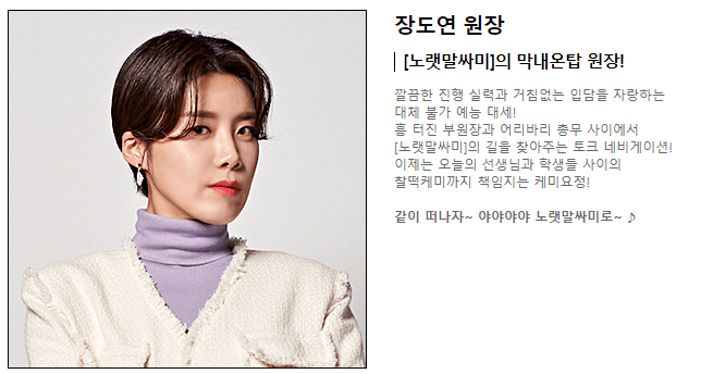 케이팝 어학당 - 노랫말싸미는 한류의 중심이라고 할 수 있는 케이팝(K-POP)을 배우며 한국어를 쉽고 재밌게 익히고 노랫말에 담긴 한국 문화를 이해하는 예능 프로그램입니다.