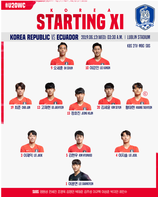 대한민국은 에콰도르와의 4강전에 고재현 선수와 김세윤 선수를 깜짝 선발로 내세웠습니다. 3-5-2 전술로 진행하며 오세훈과 이강인 투톱에 양쪽 윙백은 최준, 황태현, 스리백은 이재익 김현우 이지솔이 맡았습니다.